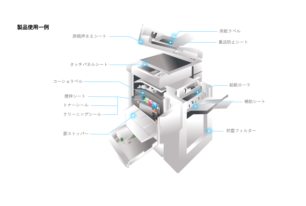 OA機器/複写機/プリンター/トナーカートリッジ OA機器 / 複写機 / プリンター/ トナーカートリッジ 複写機やプリンター、トナーカートリッジ、その他OA機器に使用されています、各種シート、ラベル、シール、その他部材などを開発・生産しています。 お問い合わせフォームはこちら