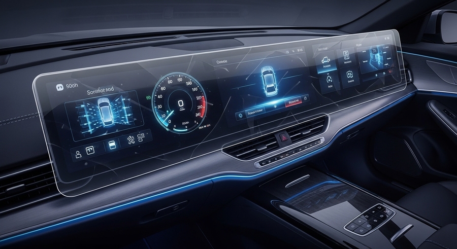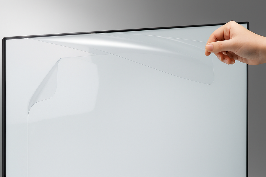 製品が製造されてから車内、指定の場所に設置されるまでの間、ディスプレイ表面を傷や汚れから守るために使用される保護フィルムです。主に物理的なダメージや摩耗を防ぐよう設計されており、使用時にはスムーズな貼り付け・剥がし作業が可能で、跡が残らない材質が採用されています。