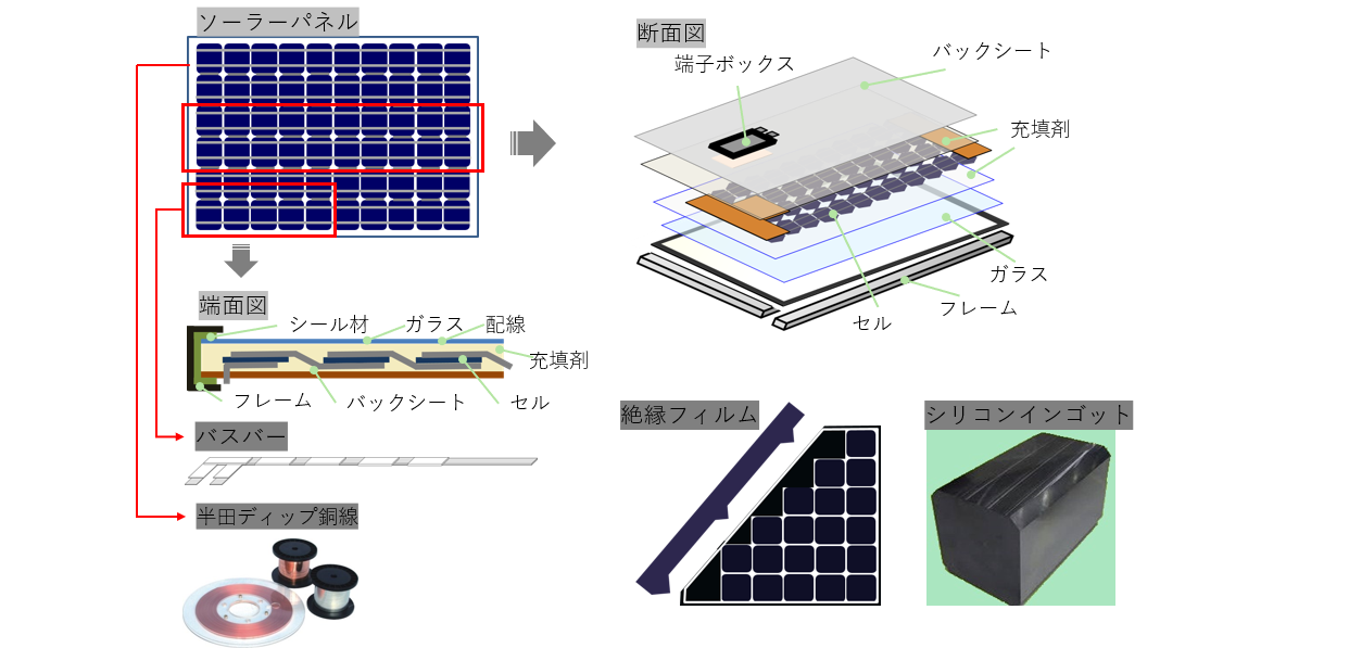 ソーラーパネルに使用されています絶縁フィルム、バスバー、半田ディップ銅線やその他部材などを開発・生産しています。