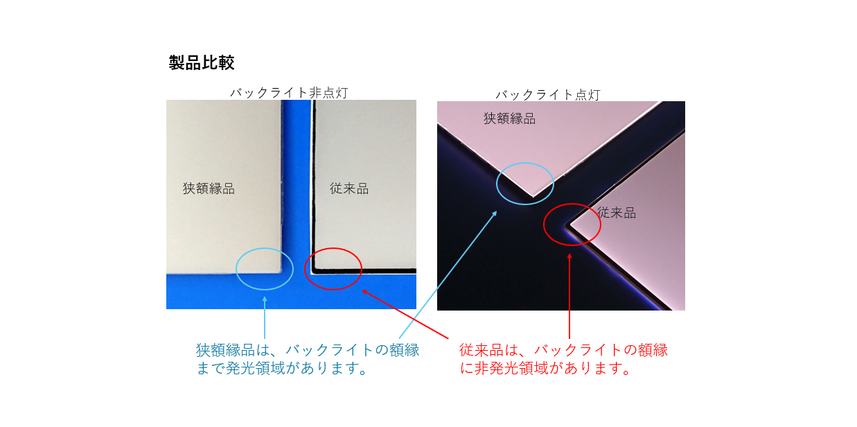 この技術により液晶ディスプレイの発光領域を表示領域とほぼ同一の広さに拡大することが可能となり、美しい商品デザインと高付加価値を両立した製品の提供が可能となりました。